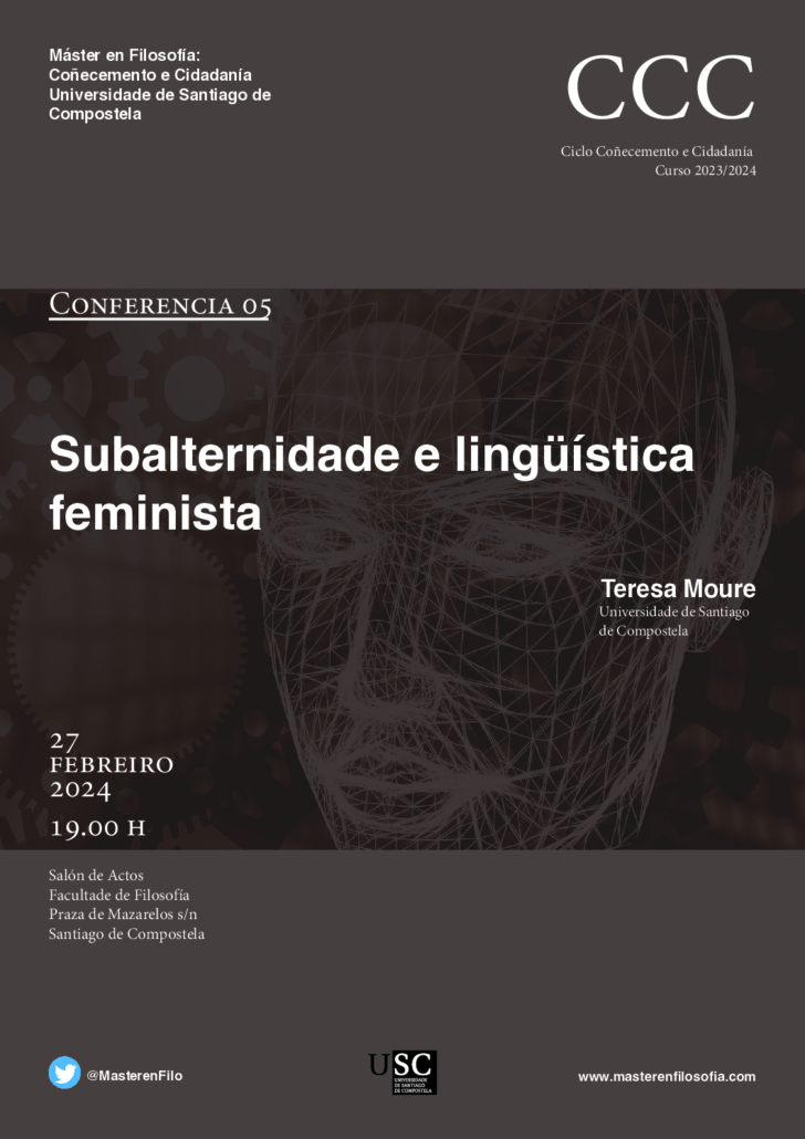 O Ciclo de Conferencias Coñecemento e Cidadanía do curso 2023/24, organizado pola coordinación do máster en Filosofía, chegou xa a súa quinta sesión e convídaos o próximo martes 27 de febreiro, de novo en horario de tarde, ás 19.00h a reflexionar con Teresa Moure, profesora da Universidade de Santiago de Compostela, sobre “Subalternidade e lingüística feminista”.