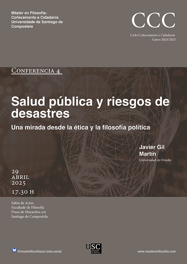 En la charla se defenderá que en los impactos de los desastres sobre la salud de las gentes a medio y largo plazo influyen los determinantes sociales de la salud, toda vez que estos contribuyen a crear riesgos de desastres y a perpetuar y agudizar las desigualdades en salud tras los desastres. Se sostendrá, además, que la salud pública es indispensable para las políticas públicas conocidas como reducción de riesgos de los desastres. En relación con esto, se aludirá a tres ámbitos en los que inevitablemente ha de involucrarse la ética (y la filosofía política) de la salud pública: la centralidad de una diversidad de cuestiones de justicia, los deberes colectivos de prevención de desastres sanitarios y, en fin, las responsabilidades colectivas distribuidas en un marco complejo de gobernanza.
